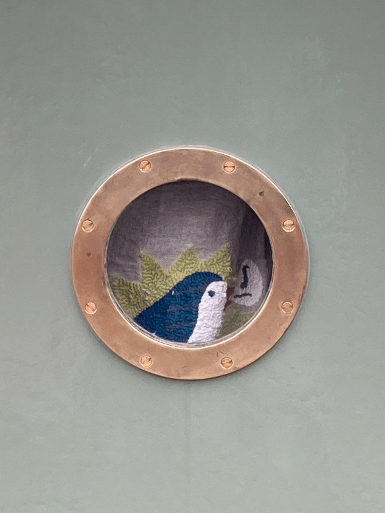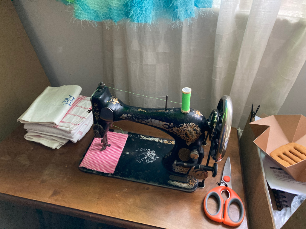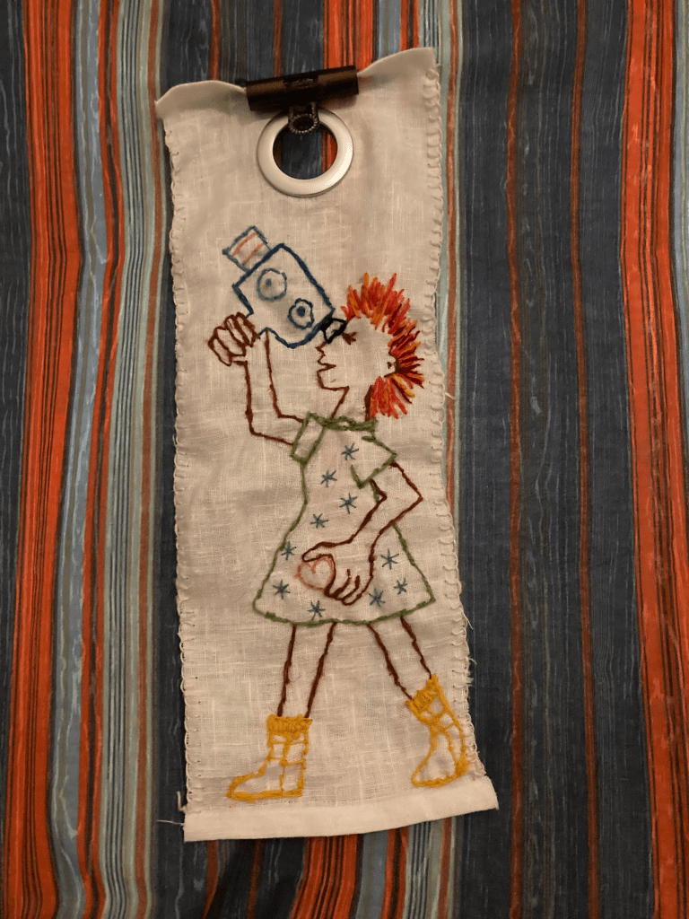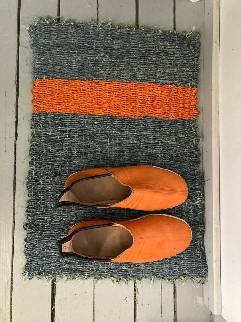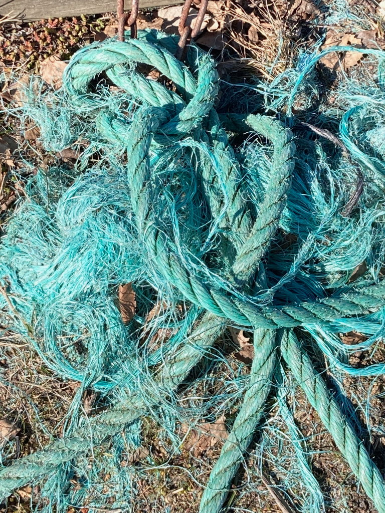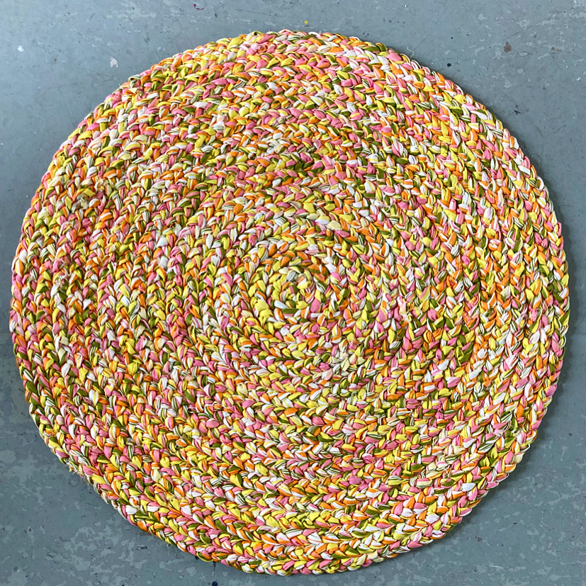 And the last stitch of the lollipop rag rug, begun in Week 1.